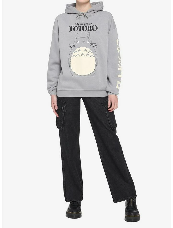 Totoro will make sure you stay nice and warm this winter! This grey My Neighbor Totoro hoodie features a graphic of Totoro in the center and the movie’s logo above him. There is also a Japanese text design on the left sleeve. Drawstring hood.