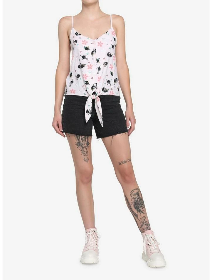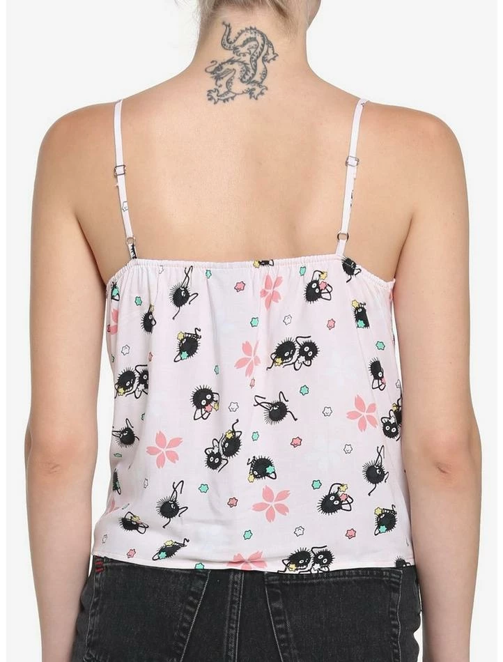 Β It can get pretty warm working the boiler room at the Bathhouse. Keep cool in this pink, Spirited Away tank! It features a toss print of Soot Sprites and their star candy, along with sakura flowers. Comes with button-up and tie-front detailing, a V-neckline and adjustable spaghetti straps.