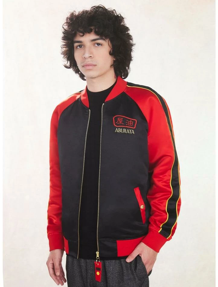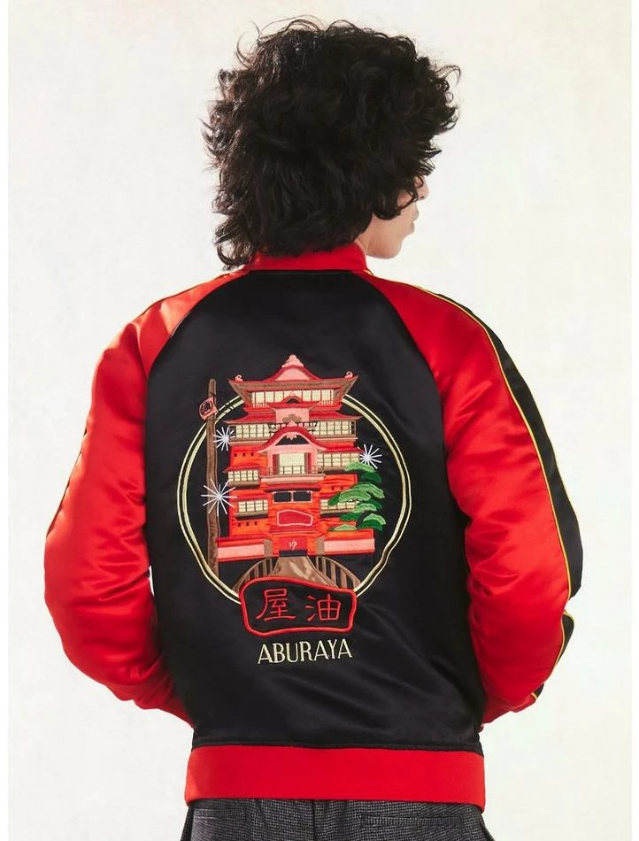 Look fresh while feeling refreshed after a trip to The Bathhouse in this Spirited Away bomber jacket! Featuring red and black color blocking and a gorgeous embroidery of The Bathhouse on the back with “Aburaya” below. Plus, “Aburaya” embroidered at the chest, along with Japanese text. Complete with snap-button front pockets and a front zipper closure.