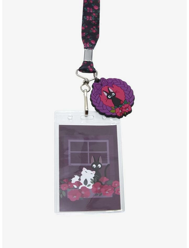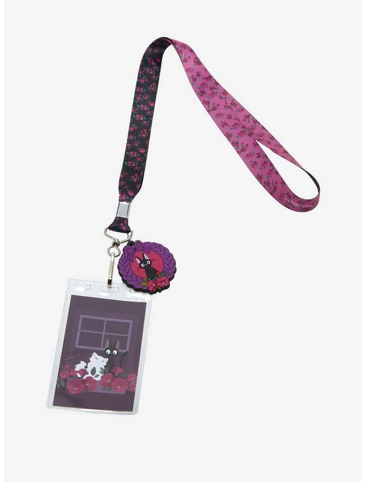 Keep your essentials secured when you’re making broomstick deliveries! Every witch needs their cat companion, so make sure to bring Jiji along with you with this Kiki’s Delivery Serviceย lanyard. Features a double-sided floral design on the lanyard, with aย floral wreath Jiji charm and a clear ID holder.