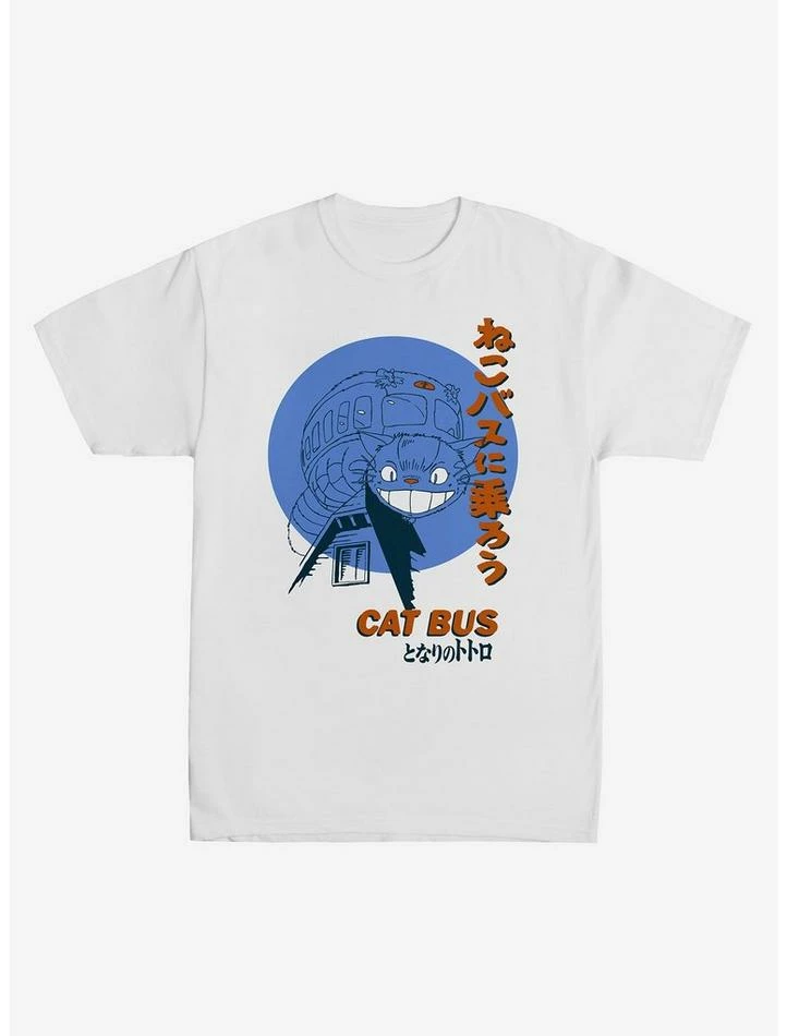 Hop aboard the Cat Bus in style! This tonal tee from My Neighbor TotoroΒ is perfect for a day of exploring with some forest spirits. Features the Cat Bus perched on top of a roof with the movie title down the side in Japanese.