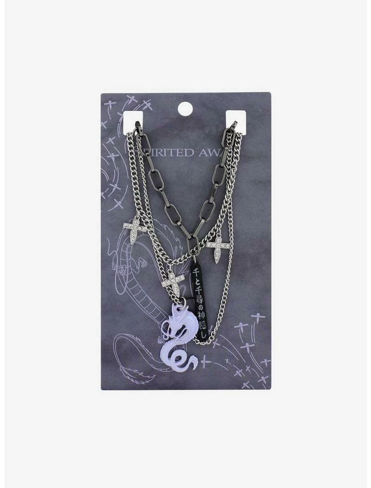 Enter the Spirit Realm with some fresh necklaces on! Rep Haku from Spirited Away with this necklace set, featuring a silver-tone piece with charms of Zeniba’s paper spirits, one with a charm of Haku in his dragon form plus a chain link design with the Spirited Away movie title in Japanese.