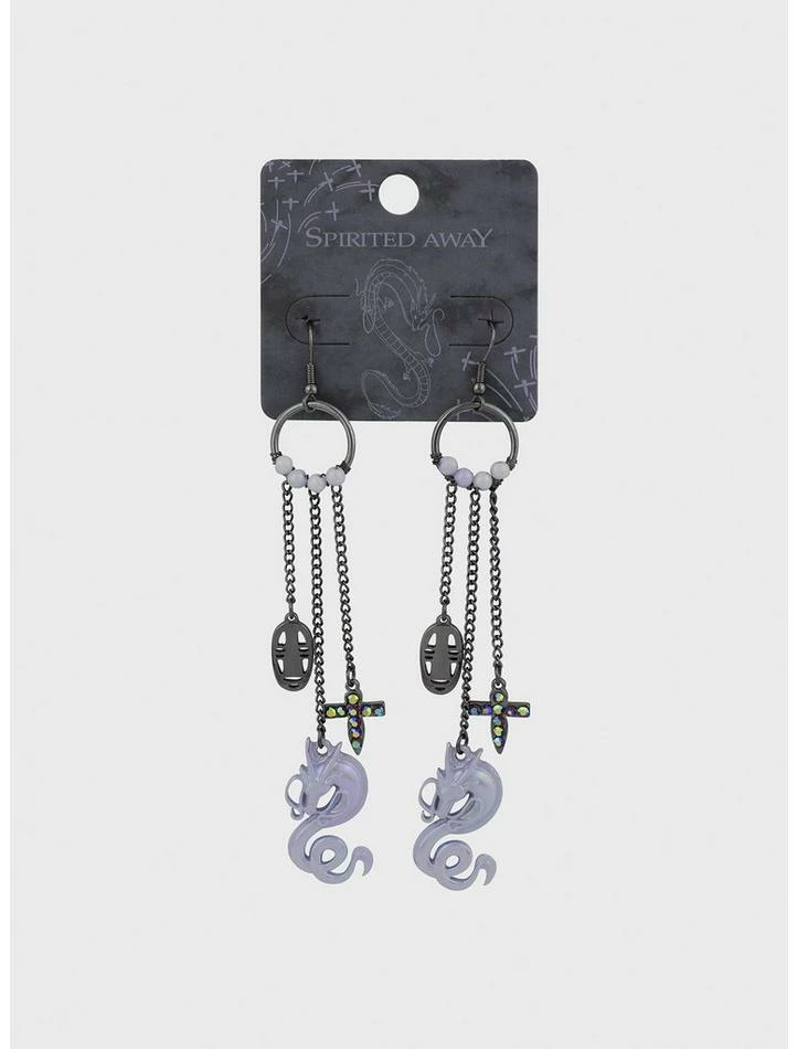 Step out of the Bathhouse in style with these drop earrings! From Spirited Away, these statement earrings are definitely Spirit Realm-approved. Features beaded detailing on an O-ring, with drop charms of No-Face, a lilac Haku in dragon form and a bejeweled Shikigami.