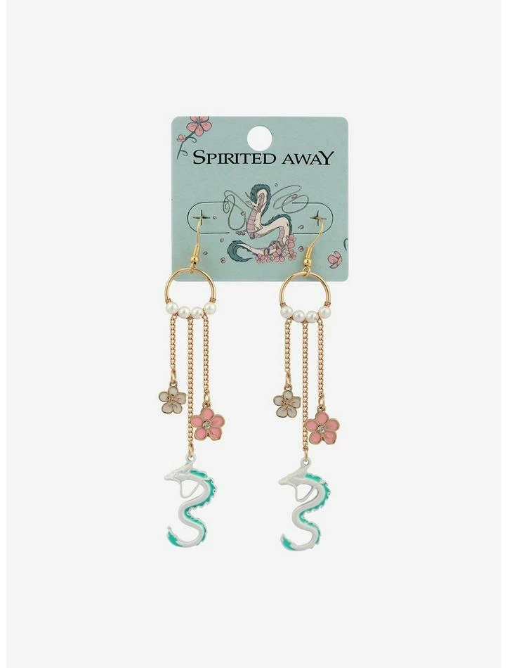 New accessories from Studio Ghibli are in full bloom! These earrings feature gold-tone rings with faux pearls and dangling chains with Haku and sakura blossom charms.